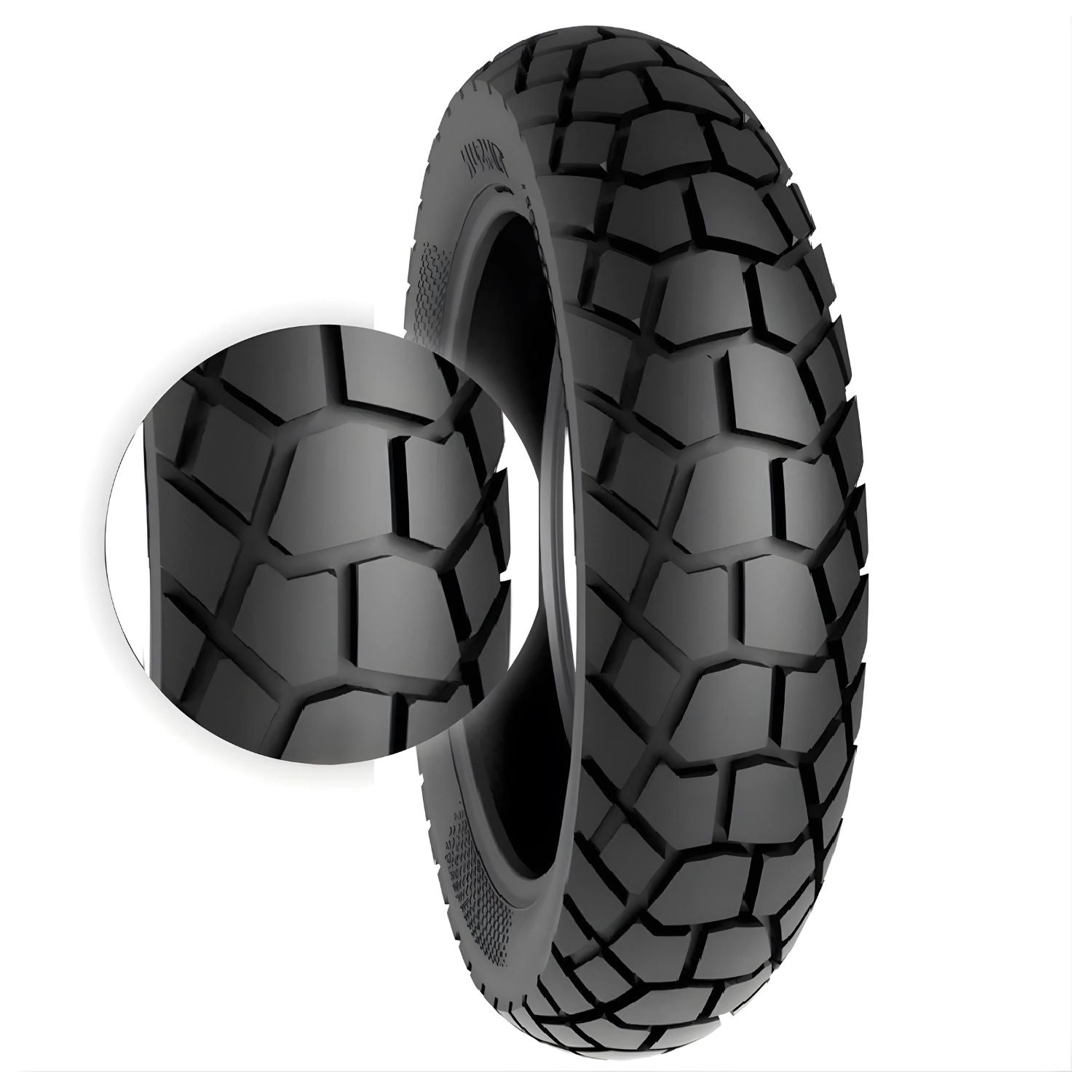 Diseño de banda de rodadura: Patrón block con surcos transversales para drenaje eficiente y tracción off-road ligera; perfil que mejora el control en curvas y rectas.