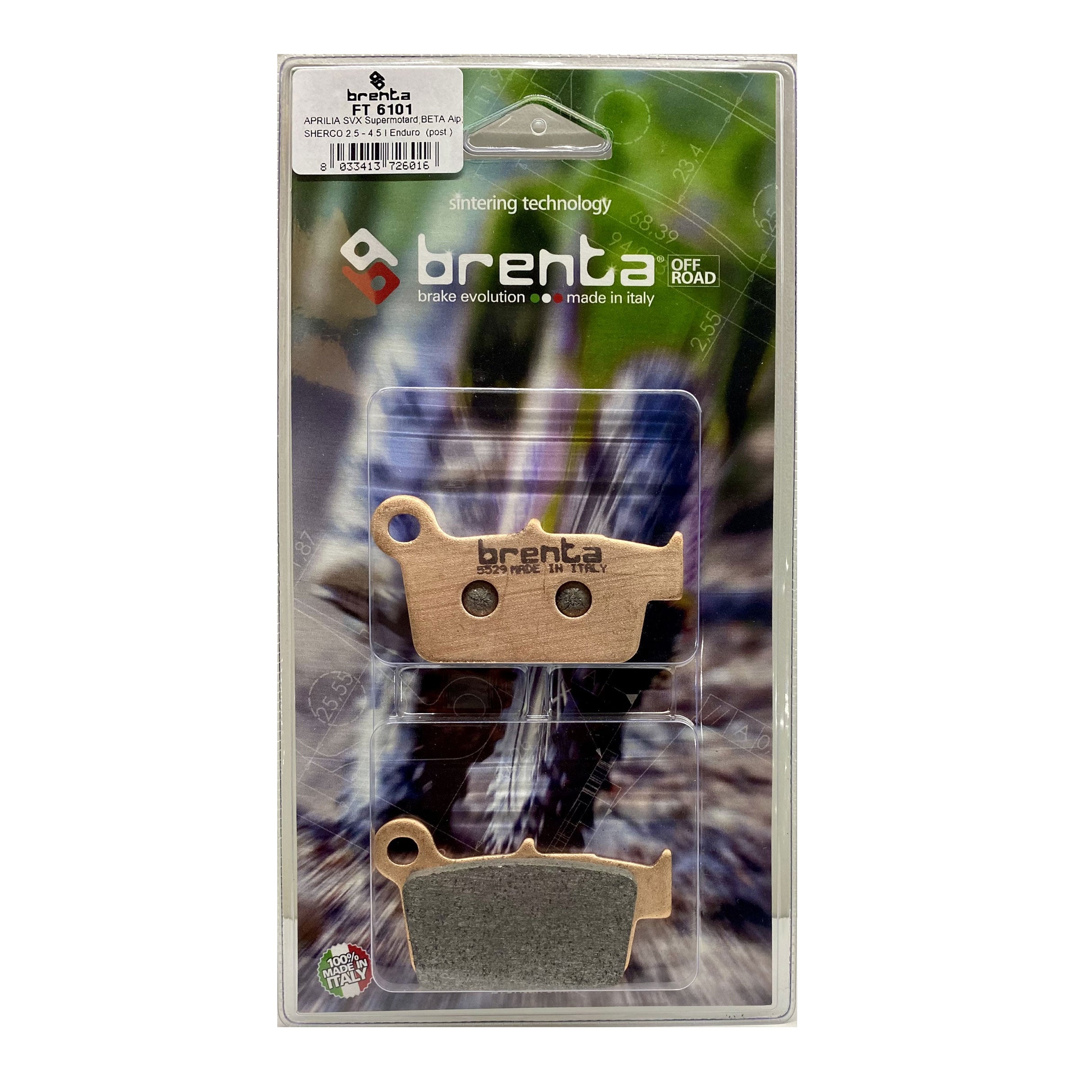 Pastilla de freno trasera Brenta BR6101 Especial para Yamaha WR450F y otras motos off-road Descripción general Fabricadas íntegramente en Italia por Frenotecnica, las pastillas Brenta BR6101 ofrecen la potencia de frenado y la precisión que exige la conducción enduro, cross y rally. Su compuesto sinterizado específico para uso off-road garantiza un rendimiento estable en barro, agua, polvo o altas temperaturas. Compatibilidad principal • Yamaha WR 450 F (2003 a la fecha) – posición trasera Además, el código BR6101 se monta en una amplia gama de modelos Aprilia, Beta, Fantic, GasGas, Kawasaki, Sherco, Suzuki, TM, Zero y Yamaha YZ/WR/FX 125-450 (ver lista completa en la sección de imágenes o ficha técnica). Características destacadas • Compuesto sinterizado off-road: alto coeficiente de fricción, óptima mordida inicial y dosificación precisa. • Fabricación 100 % italiana: control total de materias primas y procesos. • Certificaciones TÜV ABE y ECE R90: homologación europea para carretera y campo. • Procesos con norma ISO 9001:2015: consistencia lote a lote. • Longevidad superior: menor desgaste del disco y mayor vida útil en condiciones extremas. • Respuesta térmica estable: frena con la misma eficacia en descensos prolongados o tras repetidas frenadas. • Revestimiento anti-ruido y base ventilada: reduce vibraciones y evita pérdida de rendimiento por sobrecalentamiento. Especificaciones técnicas Código Brenta: BR6101 Posición: Trasera Uso: Off-Road / Enduro / Motocross / Rally Tipo de material: Sinterizado (metal sinterizado de alta fricción) Espesor pastilla: 7 mm Espesor total con placa: 10 mm Color placa: Bronce / Cobre niquelado Recomendaciones de montaje 1. Limpiar el disco con desengrasante antes de instalar. 2. Verificar espesor mínimo del disco según manual del fabricante. 3. Realizar un asentamiento progresivo durante los primeros 10-15 km con frenadas suaves y repetidas. Contenido del paquete • 1 juego de pastillas traseras Brenta BR6101 (2 unidades – suficiente para una pinza). ¿Por qué elegir Brenta? Desde 1983 Frenotecnica desarrolla materiales de fricción para competición, maquinaria industrial y agrícola. Su división Brenta aplica esta experiencia al mundo de la moto, combinando I+D, maquinaria de última generación y rigurosos controles alemanes para ofrecer productos de vanguardia a pilotos aficionados y profesionales. Domina cada curva, controla cada descenso y disfruta de una frenada fiable con las pastillas Brenta BR6101.